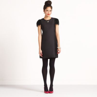 i rarely stray from a LBD, and this one seems a bit more festive than the norm with its laser-cut silk fringed sleeves (fashioned to look like ostrich plumes,) delicate lace trimmed hem, and a row of shiny buttons on the back.